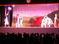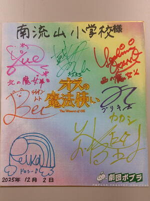 子供たちは、行儀良くすわりながらも、楽しいところでは声をあげたり、手をたたいたりしていました。役者さん達の台詞や歌、踊り、そして映像の素晴らしさにひきこまれ、楽しい時間を過ごせたと思います。劇団ポプラの皆様には、朝早くから舞台設定、2回の公演、そして後片付けと、一日がかりで大変お世話になりました。帰りには校長室に寄ってくださり、子供たちへの色紙まで頂戴しました。すてきな時間をありがとうございました!