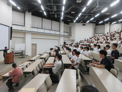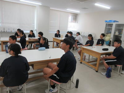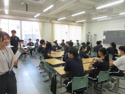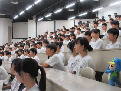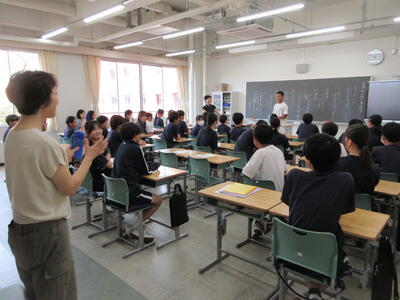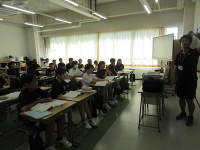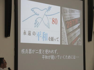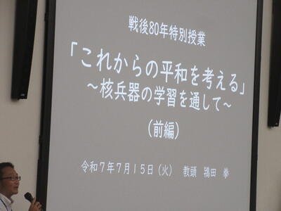 ▼戦後80年特別授業「これからの平和を考える」~核兵器の学習を通して~(前編)」が始まりました。鴇田教頭先生からは、今日の問いに対してこれが正解だという答えはないということ、平和について考えてもらうことが目的ということが大前提として伝えられます。