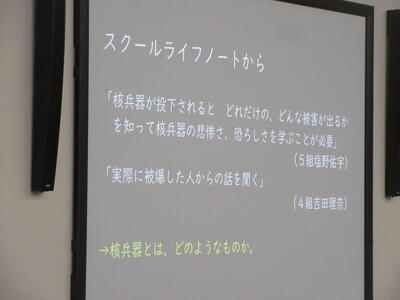 ▼スクールライフノートに書かれた子ども達の課題意識から、本時は「なぜ核兵器が大量に作られたのか。なぜなくせないのか。核兵器を持つことにどのような意味があるのか」について考えを深めていきます。