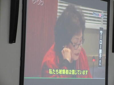 私たち被爆者は、苦しみと、生き残るための、そして灰の中から生き返るための真の闘いを通じて、この世に終わりをもたらす核兵器について世界に警告しなければならないと確信しました。くり返し、私たちは証言をしてきました。
