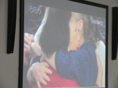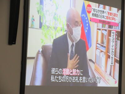 授業の終盤、子ども達はサーロー節子さんのノーベル平和賞授賞式での英語のスピーチ映像を視聴します。