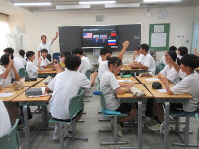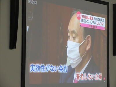 ▼様々な映像も交えた授業の最後、鴇田教頭先生は子ども達に次の問いを投げかけます。「日本は核兵器禁止条約に参加するべきか?」