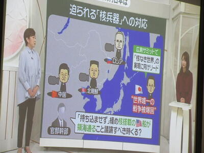 ▼前回の通常の社会科の授業のラストに、鴇田教頭先生が登場し、今回の授業についての予告がなされていました。その後、スクールライフノートを通じて、子ども達の生の声を拾い上げていた鴇田教頭先生。「核兵器とは、どのようなものか」「核兵器をめぐって世界と日本は何をしているのか」を中心に学習していくことが示されます。