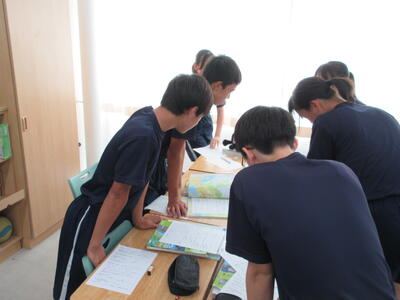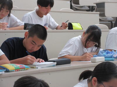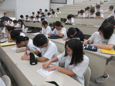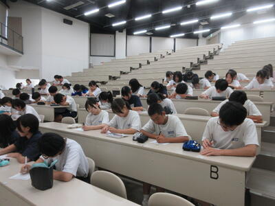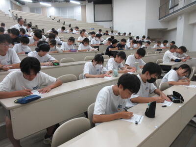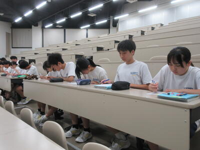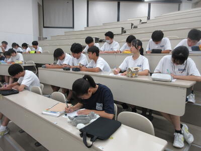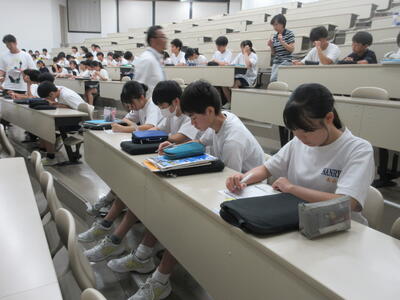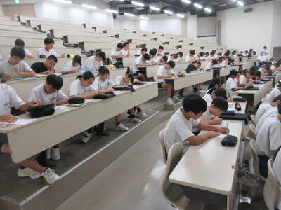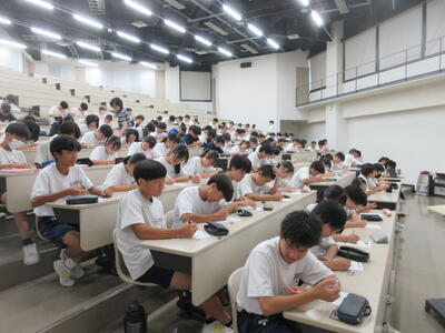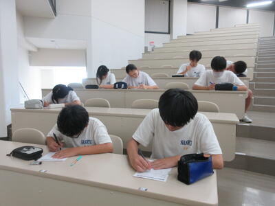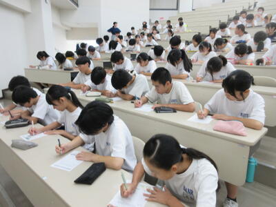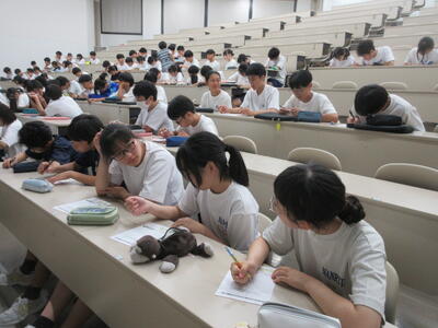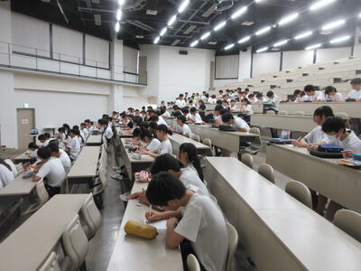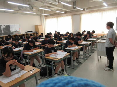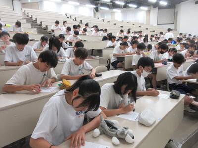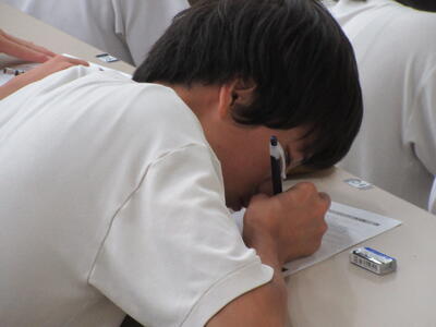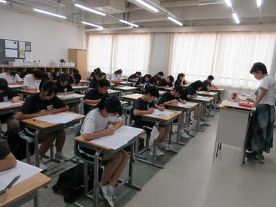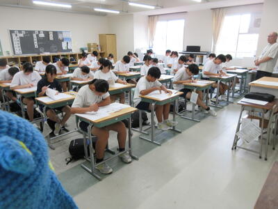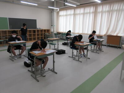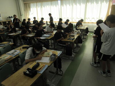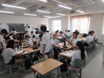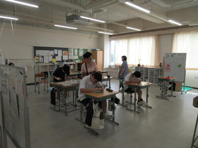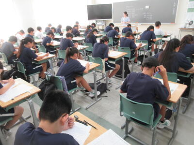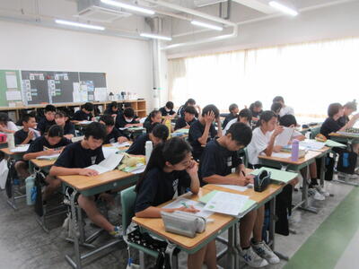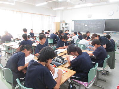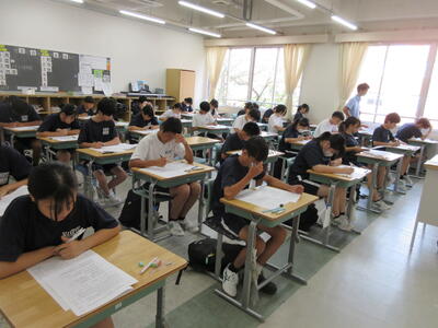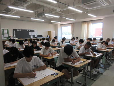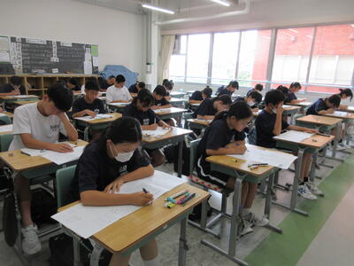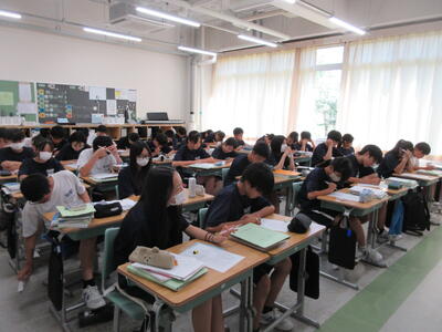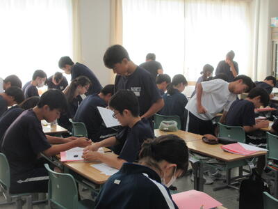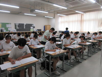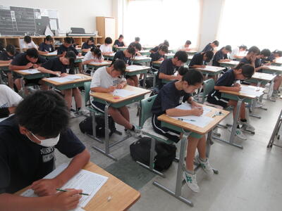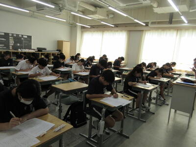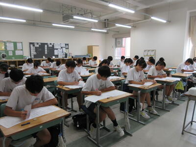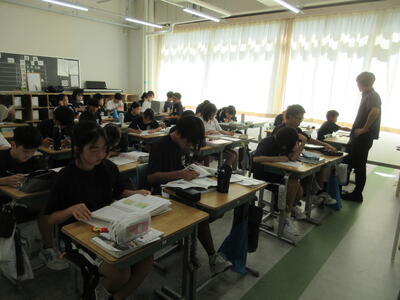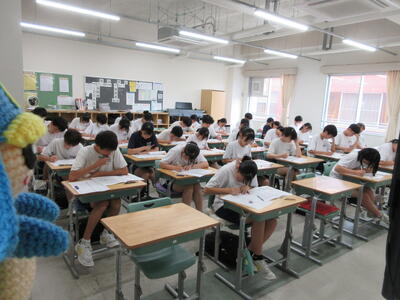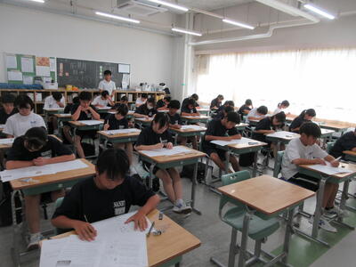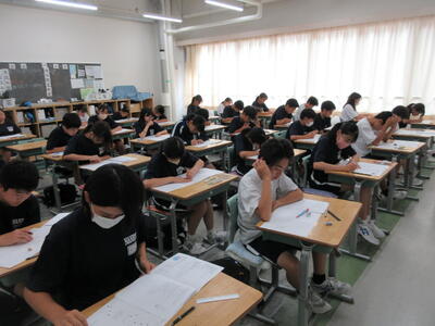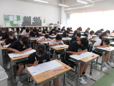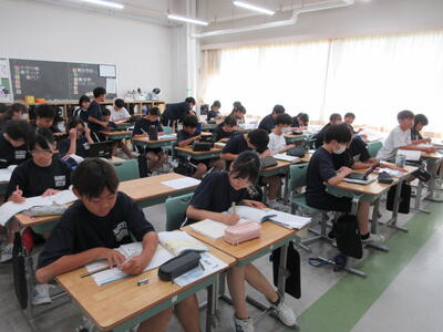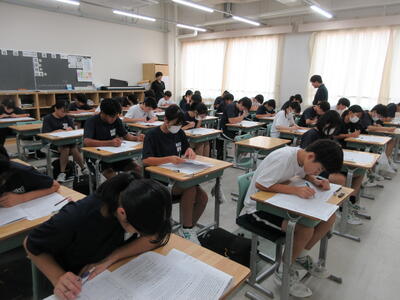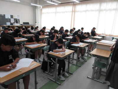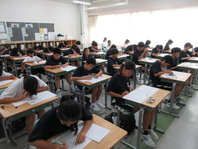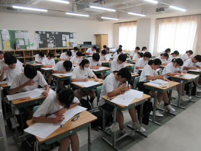 ▼前期の期末試験初日。国語、理科、英語、技術家庭科の試験が行われています。頑張る子ども達の姿が広がります。
