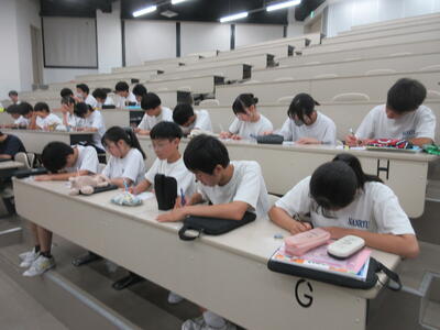 ▼一人ひとりが真剣に考え、自分の考えをまとめ、自分の言葉で書いていきます。これだけたくさんの子ども達いますが、ホールは静まりかえっています。