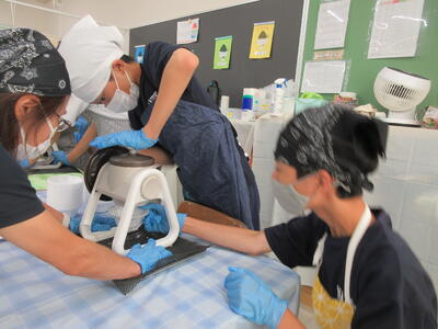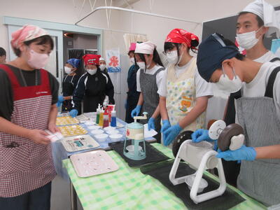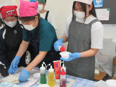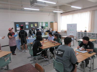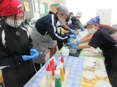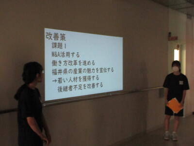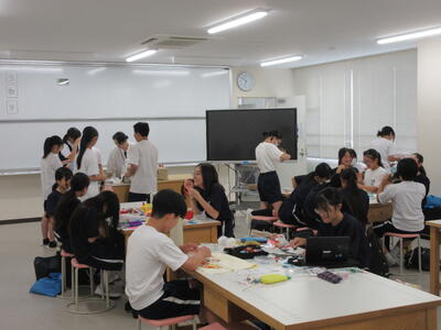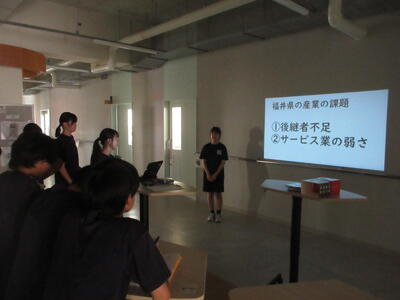 ▼調理室では、食中毒について班ごとのプレゼンが行われています。人に伝えることで自分にとって大きな勉強になっていきます。
