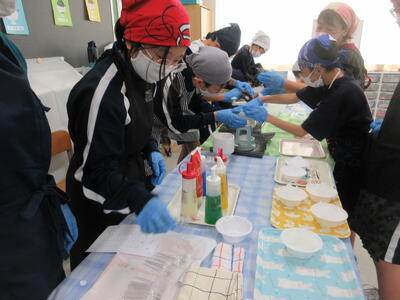▼第2理科室での授業の様子。河野先生の手元で起こる変化に子ども達も興味津々。理科って楽しいですね。