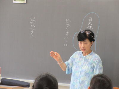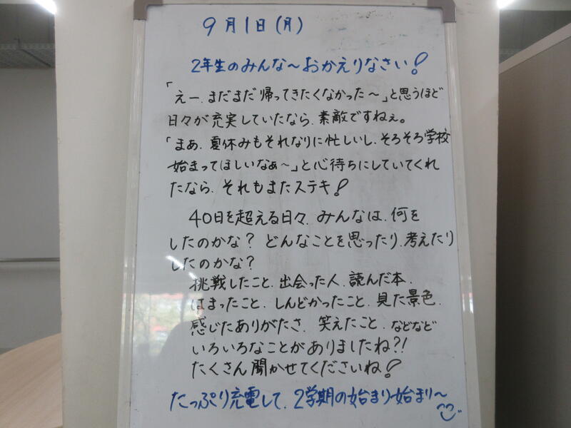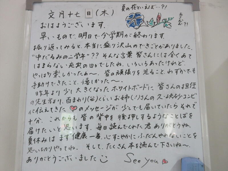 ▼C棟2階のホワイトボード。学年主任の渡邉久子先生からの1学期最後のメッセージが書かれています。