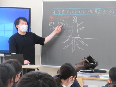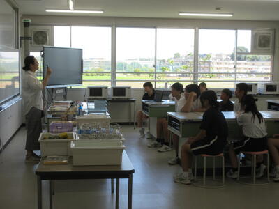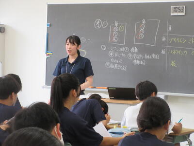 ▼学年主任の田中先生の理科の授業。生徒とのやりとりが楽しい時間が続いていきます。