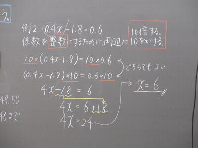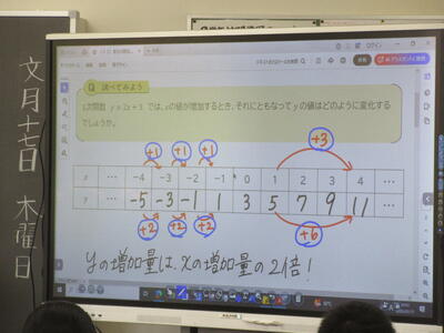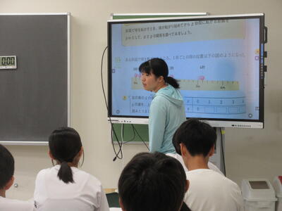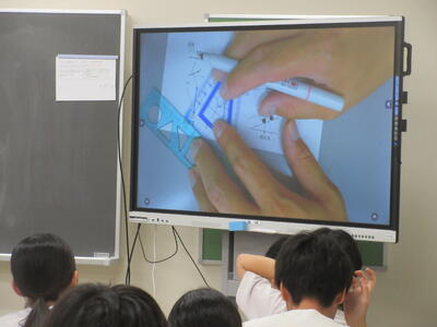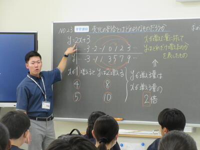 ▼1年生、春日先生の情熱あふれる数学の授業。子ども達も集中して取り組んでいます。