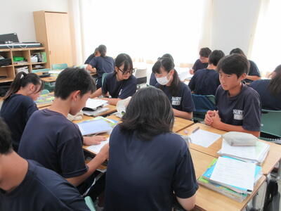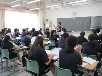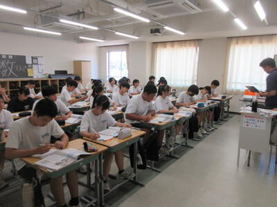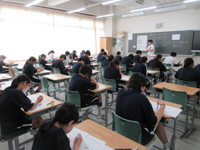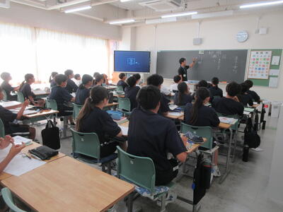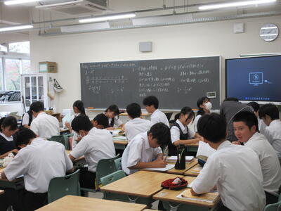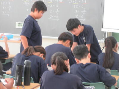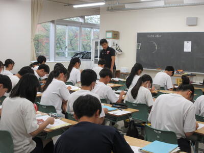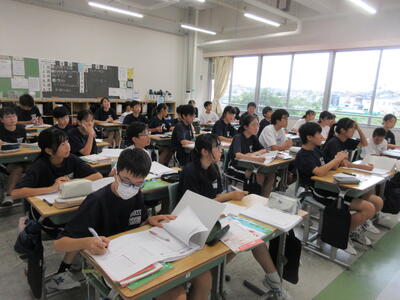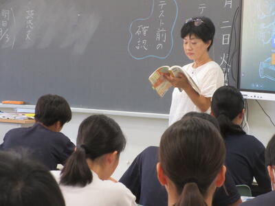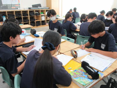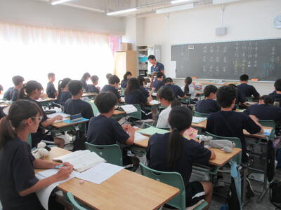 ▼3年生の授業の様子。進路決定に向けて大切な定期テスト前日、子ども達は、いつもにも増して集中して授業に臨んでいるようです。先生方も子ども達の頑張りに応えようと丁寧に確認を行います。3年生のみんな、自分の目標に向けて思い切り頑張れ!!