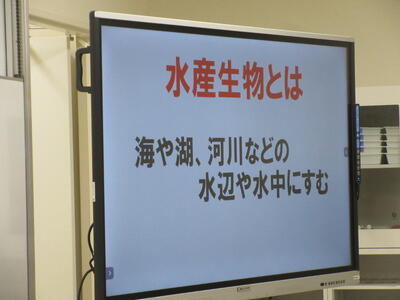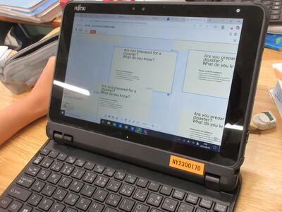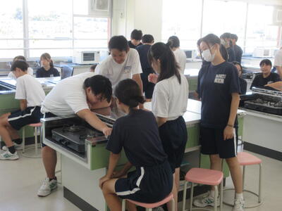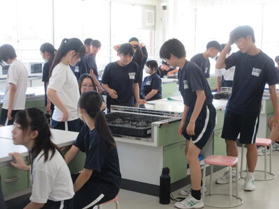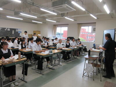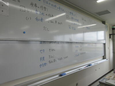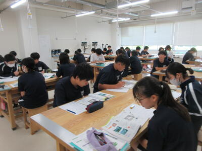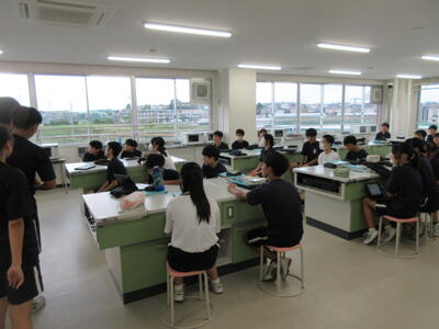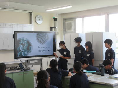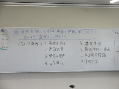 ▼調理室では、食中毒の事例について、原因物質、特定の理由など、グループごとの発表が行われています。ここでも発信型の授業が展開されています。