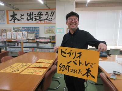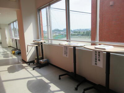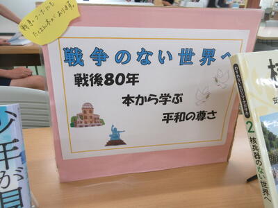 ▼図書室では「戦争のない時代へ 戦後80年 本から学ぶ平和の尊さ」と銘打って、戦争に関する本が並んでいます。ぜひ手に取って読んでもらいたいですね!!
