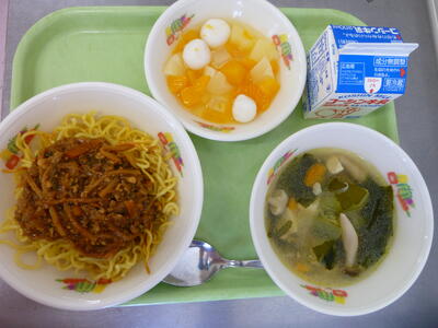 今日の給食は【ジャージャー麺、冬瓜とわかめの中華スープ、白玉フルーツポンチ、牛乳】です。残さず食べましょう。