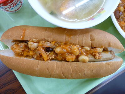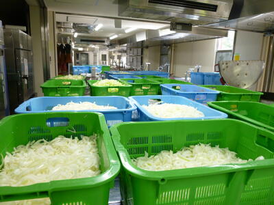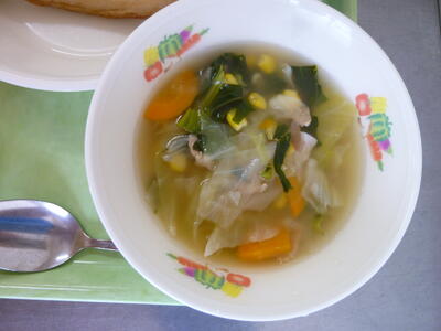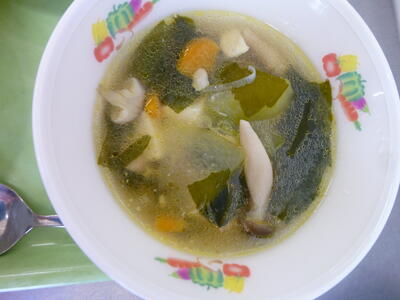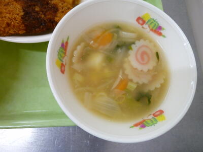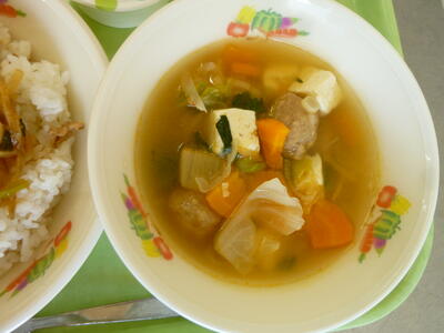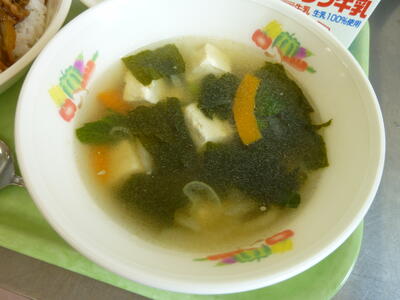 ジャージャーという面白い言葉の響きの麺は、油でカラッと揚がった部分と濃厚な肉みそで柔らかくなった麺が絡み合い、口に入れた時の食感も、「パリパリ」「スルッ」と味わい深くとても楽しいメニューでした。冬瓜とわかめの中華スープは、透明になるまで柔らかく煮込んだ冬瓜とわかめが鶏ガラスープでさっぱりといただきました。最後に食べたデザートの白玉フルーツポンチは、見た目が鮮やかながら味はさわやかな甘みで、最後までおいしくいただきました。栄養士さんをはじめ調理員の皆さん、今日も最高の給食をありがとうございました!!