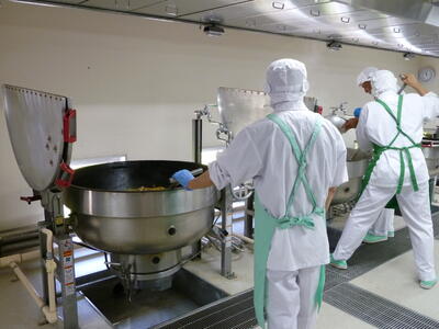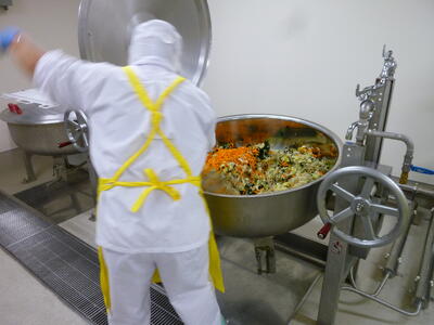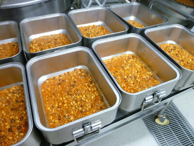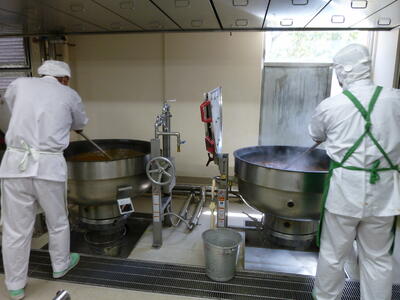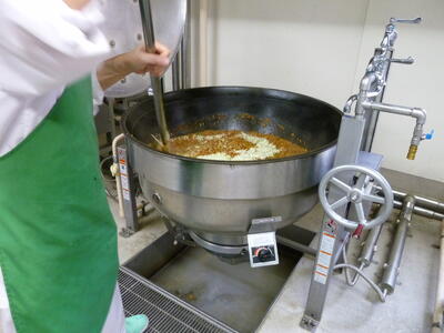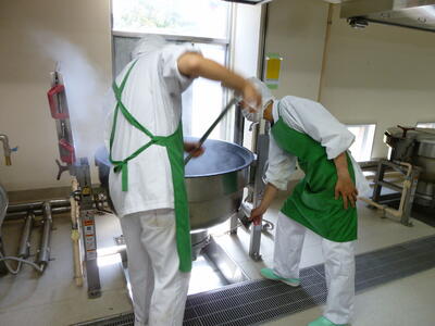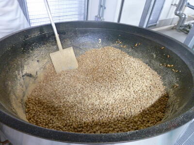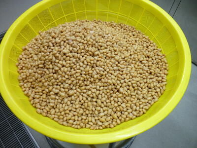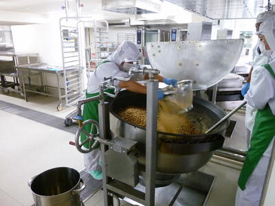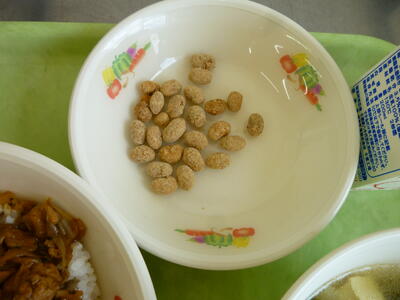今日は、「黒糖きなこ大豆」について紹介します。カリカリとした食感がおいしいこのメニューは、炒った大豆(煎り大豆とも書きます)に黒砂糖のシロップをからめて、最後にきなこをまぶして作ります。給食で色々な料理に使っている大豆は、「畑の肉」と呼ばれるほど、良質なたんぱく質を豊富に含んでいますその他にも、食物繊維や無機質類、ビタミン類などが小さな粒の中にぎっしりと詰まっていて栄養価が高く、昔から日本の食生活を支えてきた食材です。豆としてそのまま食べるだけでなく、みそやしょうゆ、豆腐や納豆など、様々な形で加工されています。きなこも大豆の加工品の一つで、黄色い大豆を粉にするため、「黄粉」と呼ばれます。