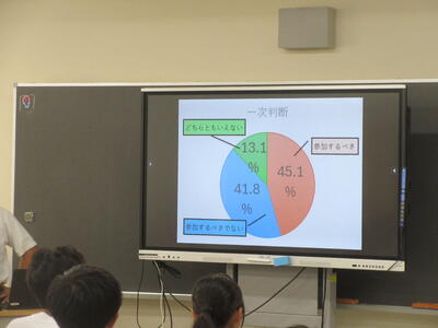 前回の授業の最後、鴇田教頭先生から子ども達に投げかけられた問い「日本は核兵器禁止条約に参加するべきか?」について、子ども達の一次判断結果が示されます。拮抗している子ども達の判断。それだけ難しい判断でもあるという証拠です。