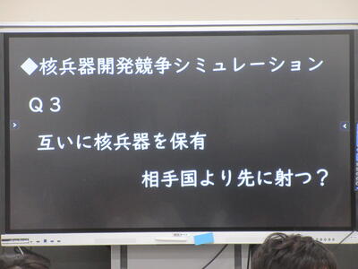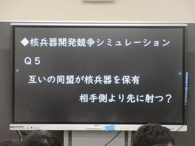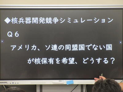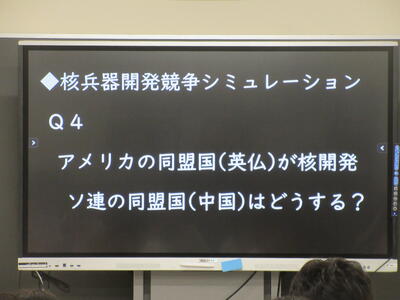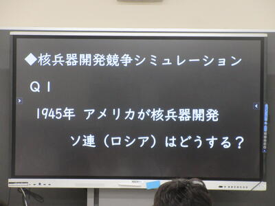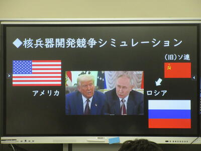 そこで、「核兵器開発競争シミュレーション」と題して、グループごとにアメリカ側とロシア側に分かれ、それぞれの立場で、様々な状況下でどう考えるのかを考えていきます。