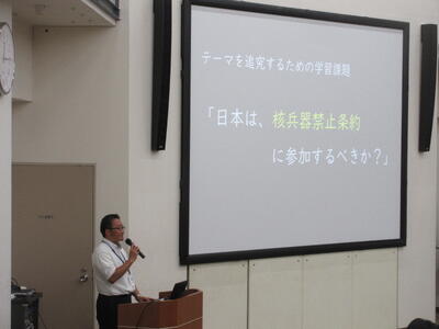 核兵器禁止条約に参加するべきかどうか、という、正解のない問いについて考えてもらいました。とても難しい課題だったと思います。大人でも結論が出せない人がたくさんいると思います。授業をしている私も、この問題については何年も考えていますし、この授業をつくるために、核兵器禁止条約について書かれた本を7~8冊ぐらい読みましたが、未だに自信を持ってこれが自分の結論だ、という考えはまとまっていません。