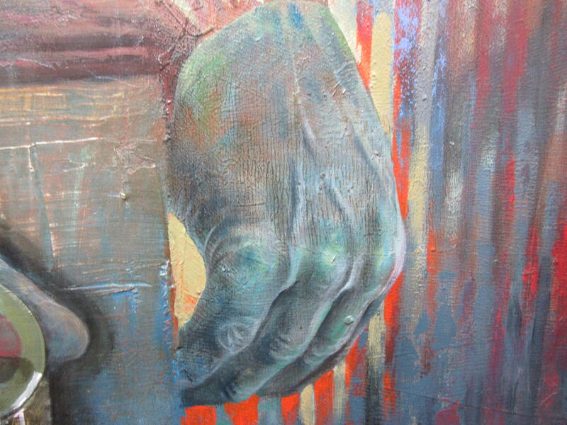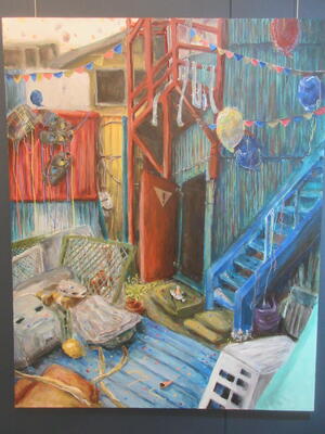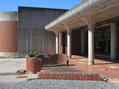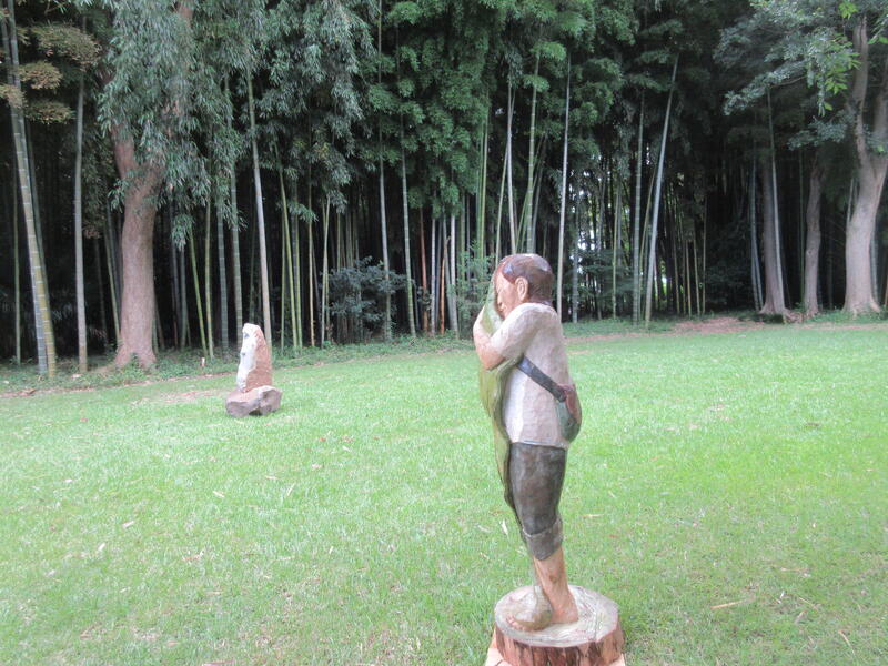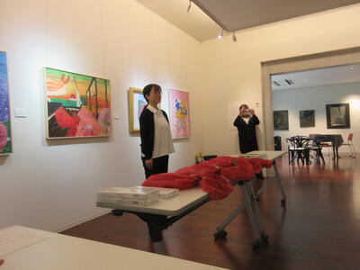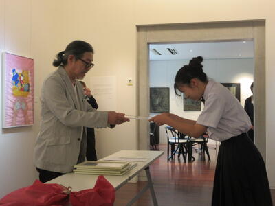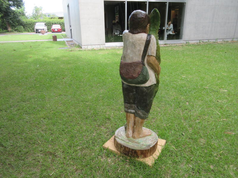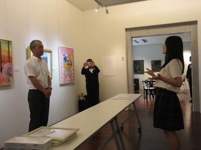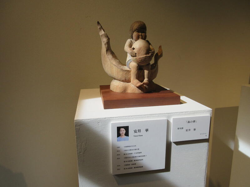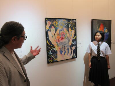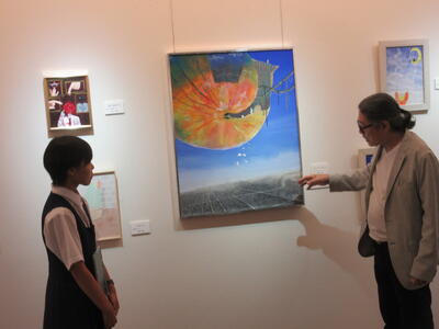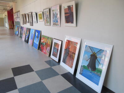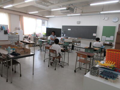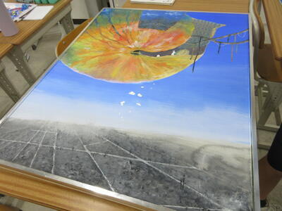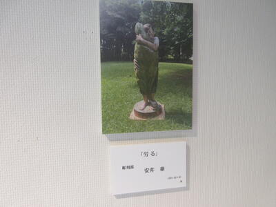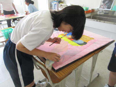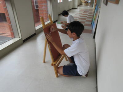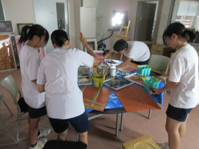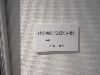 E棟からF棟にかけての美術室前。3年生の子ども達が自分の作品に真剣に向き合います。