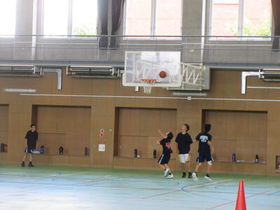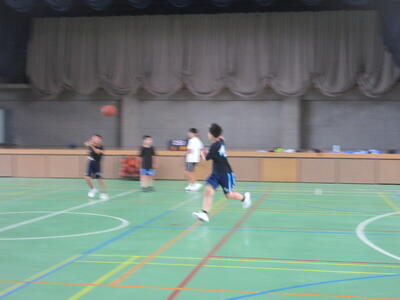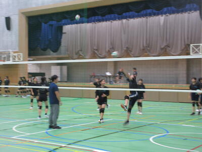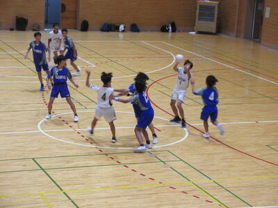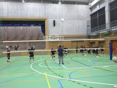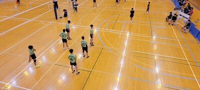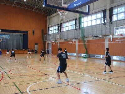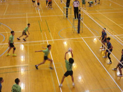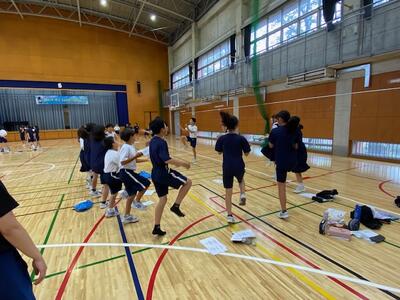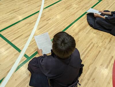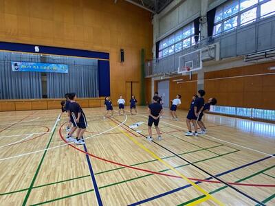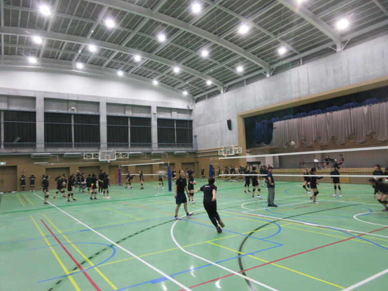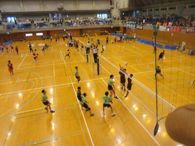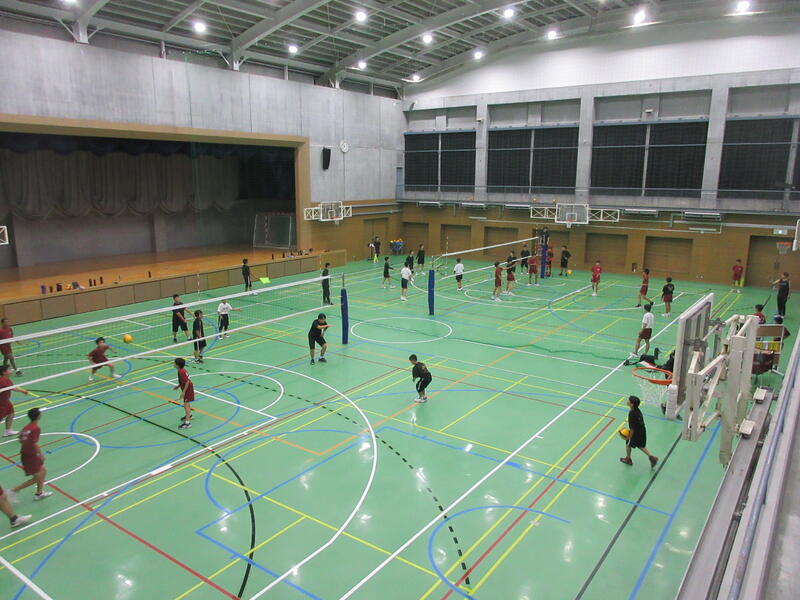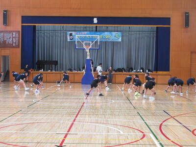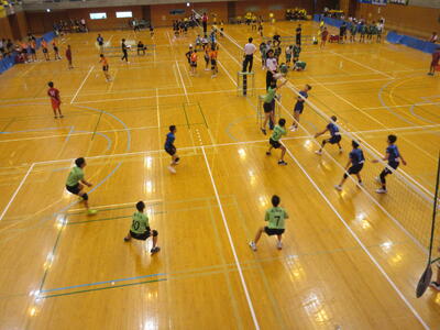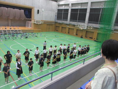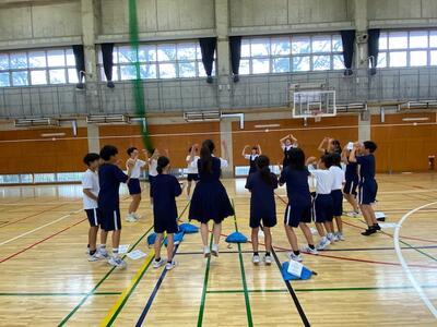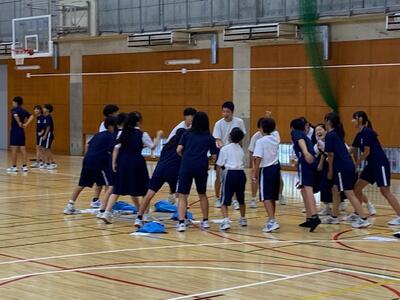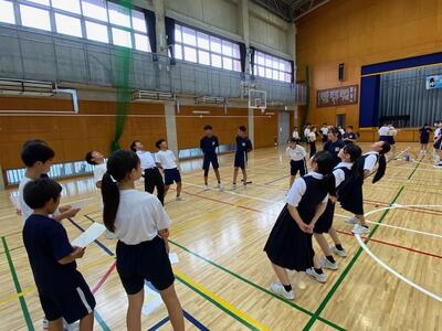 ▼昼休みの第1体育館。体育祭の各カラーごとに丸くなり、応援団の顔合わせ。そして声出しなどを行っています。もう体育祭が始まったかのような気迫あふれる子ども達の声が体育館中に響き渡ります。