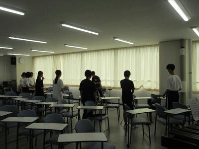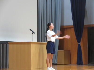 昨日9月8日(月)昼休み、D棟3階~4階のホールにて、明後日行われる「葛北地区英語発表会」に出場する稲垣理央さん(3年)の発表リハーサルが行われました。この日の会場には、指導にあたってくださった橋本クリスティン先生を始めとする英語科の先生方、スクールアシスタントの益戸先生(実は英語の先生)、市事務の本田さん(実は英語のエキスパート)、それに担任の鮒藻先生や学年主任の田中先生、そして同じクラスの仲間も応援に駆けつけてくれました。