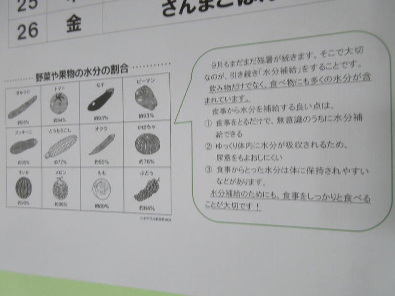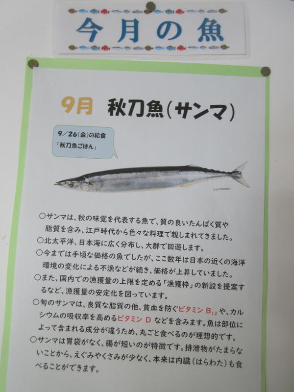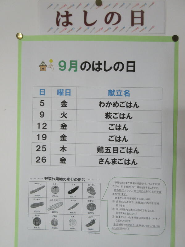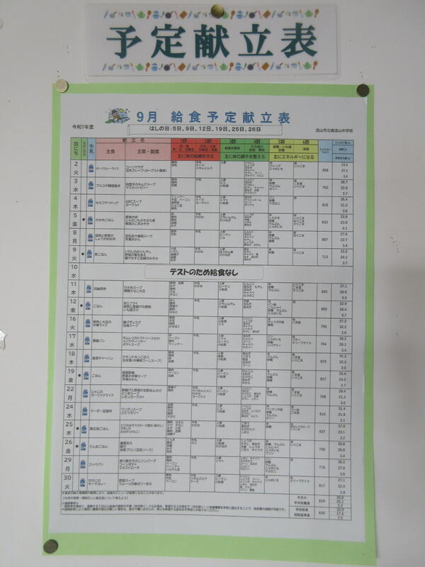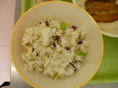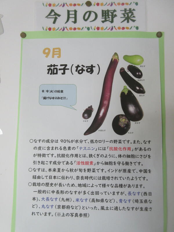 まだまだ暑い日が続きますが、献立はすっかり秋めいてきました。食欲の秋を満たされるような重陽の節句のメニューは、食べて厄除けをしたような心持ちになりました。どの献立も家庭ではあまり作られない珍しい献立で、萩ご飯の彩りの美しさや野菜の菊花和えのさっぱりとした和え物はとてもおいしかったです。いわしのみりん干しは味のアクセントがあり、ご飯がもりもり進みました。みそ汁には、とっても大きな揚げなすがたっぷり入っていて、食べるみそ汁は心までほっとさせてくれるメニューでした。栄養教諭の先生、調理員の皆さん、今日もおいしい給食をありがとうございました!!