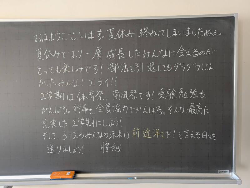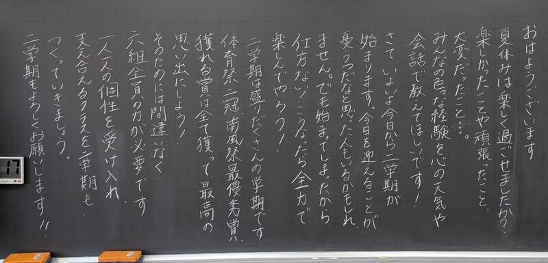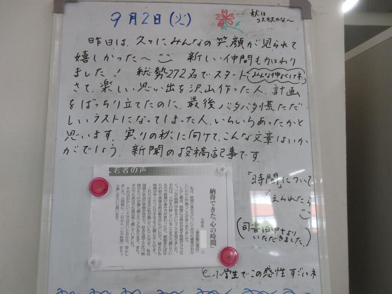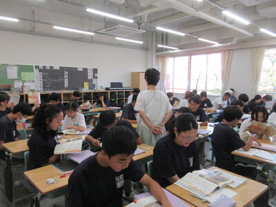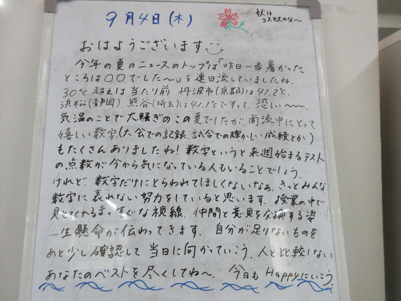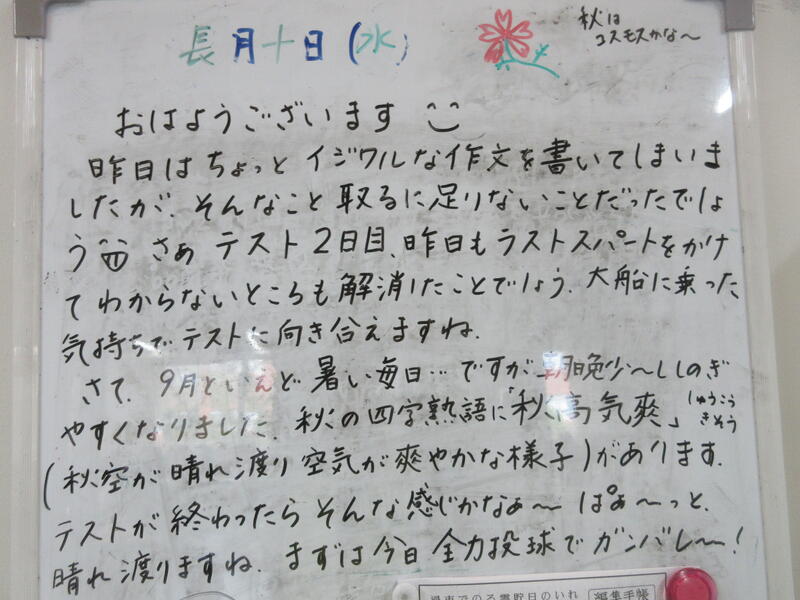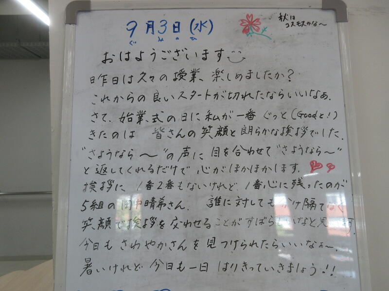 2学期第2週目の初日。前期、期末テスト前日となりました。今日も各教室では積極的に授業に取り組む子ども達の姿が見られます。