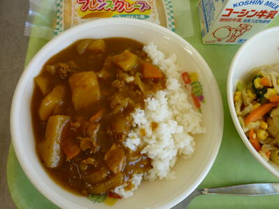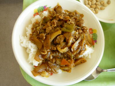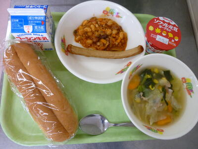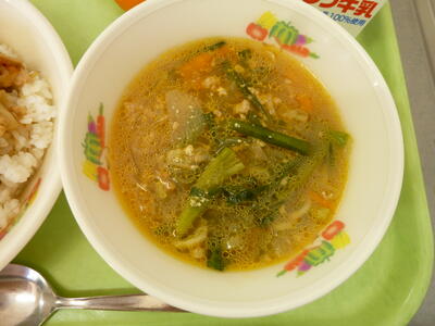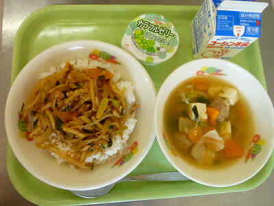 週の後半が近づく木曜日、今日は豚肉のたくさん入った回鍋肉丼をたっぷり味わい、元気をもらいました。丼物は食欲のない時でも食べやすく、栄養をしっかり取ることができるメニューでした。さっぱりとしたわかめと野菜のスープで落ち着き、黒糖きなこ大豆に取り掛かりました。畑のお肉と言われているほど、栄養たっぷりの大豆のデザートは、甘みがあって一粒一粒、食べ応えがありました。今週もあと1日、頑張れる気がします。今日もおいしい給食を作っていただいた栄養教諭の先生、調理員の皆さん、ありがとうございました!!