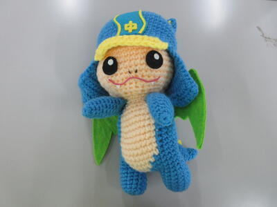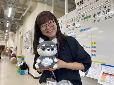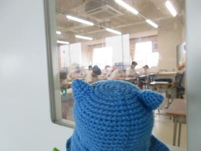 ▼サポート指導員の馬場先生手作りの南流中公式キャラクター「にゃんりゅう」。今日はテストを受ける子ども達の応援に各教室を回っています。