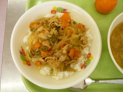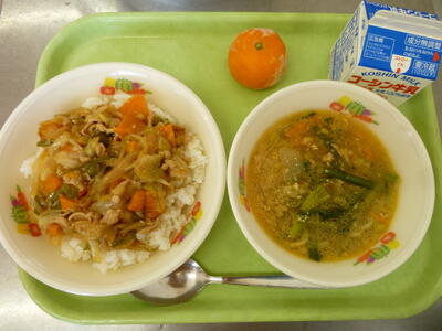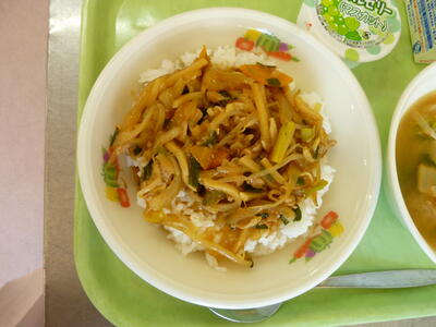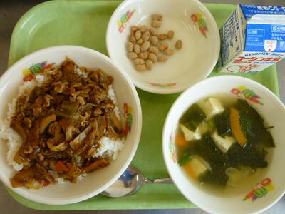 今日の給食は【回鍋肉丼、わかめスープ、黒糖きなこ大豆、牛乳】です。
