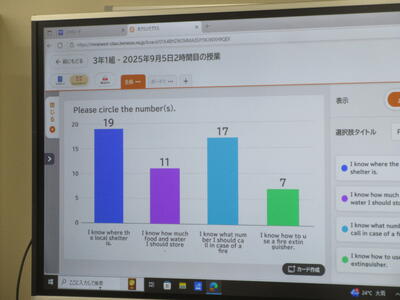 ▼3年生英語の授業。双方向でクイズ感覚で学習できるプラットフォーム、カフートを活用して、楽しみながら学習が進められています。リアルタイムで結果が出るため、子ども達も夢中で取り組んでいます。