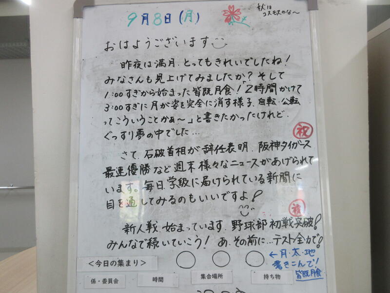 昨日までと比べると涼しい朝を迎えた南流中。過ごしやすさもあって、子ども達も朝から活発に学校生活を送っています。