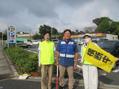 ▼思井福祉会館前の交差点では、いつものように田中前教育長と、今日は梅澤流山市消防団長、PTAの目黑会長が安全をがっちりと守ってくださっています。本当にありがとうございます!!