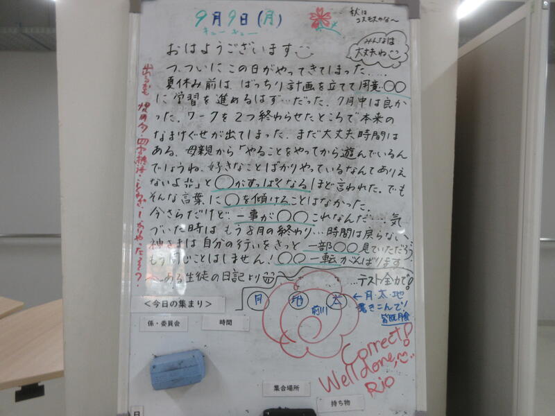 ▼C棟2階のホワイトボード。河崎先生からのメッセージ。頑張る子ども達を応援してくれます。
