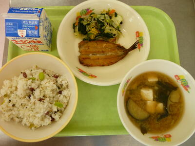 今日の給食は【萩ごはん、いわしのみりん干し、野菜の菊花和え、揚げなすと豆腐のみそ汁、牛乳】です。