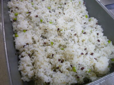 ご飯には小豆と枝豆を混ぜています。秋の七草の一つに数えられる萩の花の、赤紫色の花と、緑色の葉の色に例えています。また、夏から秋が旬のなすは、「9のつく日になすを食べると風邪を引かない」といわれ、重陽の節句に欠かせない食材の一つです。まだまだ日中は暑いですが、秋の風情を味わいながら食べましょう。