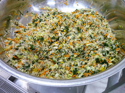 今日のジャージャー麺は、豚ひき肉に細かく砕いた大豆も加えています。具材の食感も味わいながら食べましょう。
