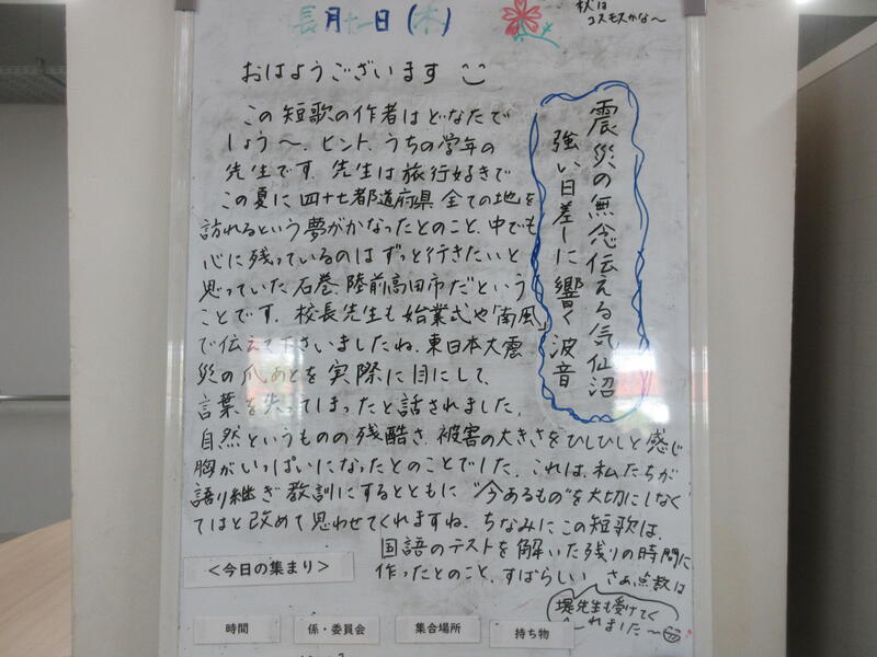 ▼C棟2階のホワイトボード。河崎先生からの丁寧なメッセージが書かれています。胸に響く短歌ですね。