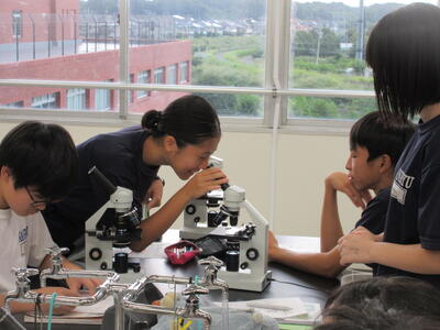 ▼第1理科室での授業の様子。一人一台の顕微鏡で植物の茎や根の特徴を観察していきます。
