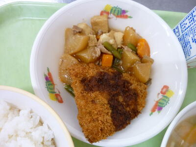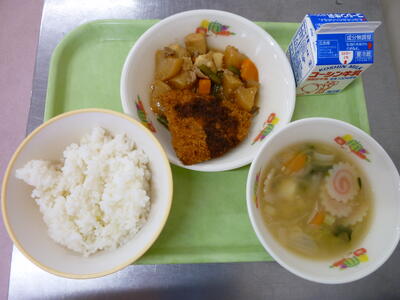 今日の給食は【ごはん、あじフライ、豚肉と厚揚げの煮物、いも団子汁、牛乳】です。