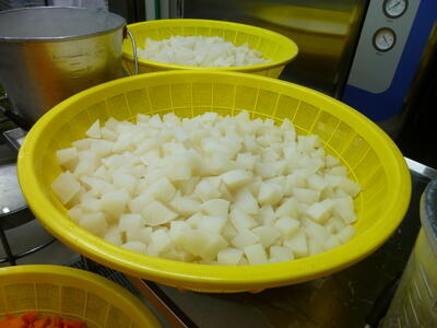今日は、カラッと揚がったあじフライが香ばしくて、しっぽまで全部あっという間に食べてしまいました。続いて、豚肉と厚揚げの煮物は、ほろほろに煮て柔らかくなった豚肉が、厚揚げと絶妙にマッチしていて食べやすく、ご飯がとっても進みました。いも団子汁は、もっちりとした団子に出汁の味がしみていて、野菜とともに食べ応えがありおいしかったです。今週も最高の給食を作ってくださった栄養教諭の先生、調理員の皆さん、ありがとうございました!!