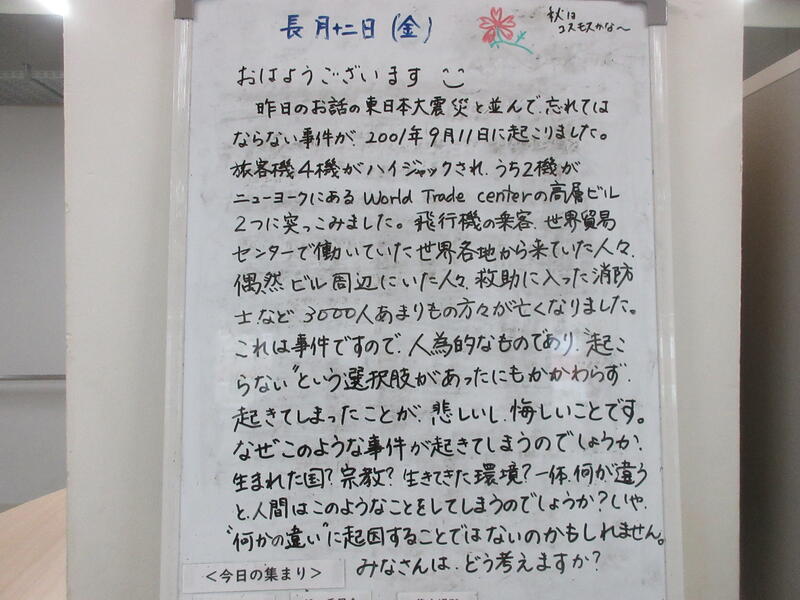 ▼C棟2階のホワイトボード。週の最後は学年主任、渡邉久子先生からのメッセージです。世界各国を旅して、多くの方々と触れ合った先生だかからこその言葉が並んでいます。全ての個性を認め合える、尊重し合える世界はいつ訪れるのか。子ども達にはそういう世界を作れる人になって欲しいですね。決して遠い存在のことではなく、実現のカギは我々の日常生活から繋がっているはずです。