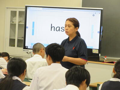 ▼3年生英語の授業。グループ対抗でいかに早く文を組み立てるかを競っています。活気に満ちあふれる教室。