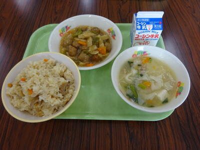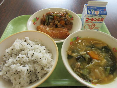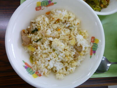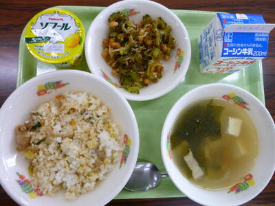 今日の給食は【焼肉チャーハン、ゴーヤーとじゃこと大豆の揚げ煮、わかめスープ、レモンヨーグルト、牛乳】です。