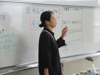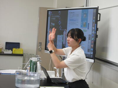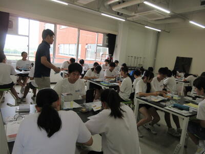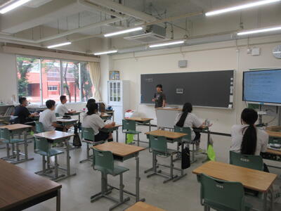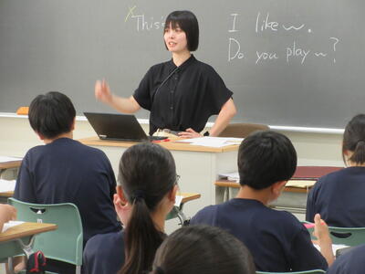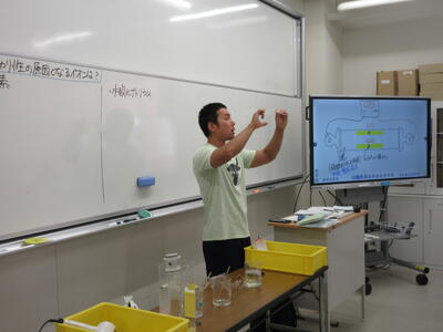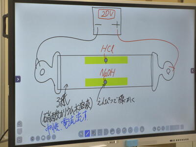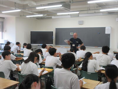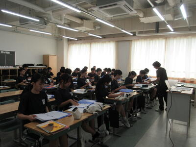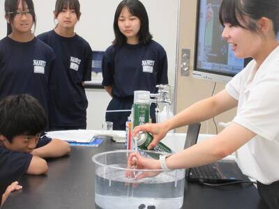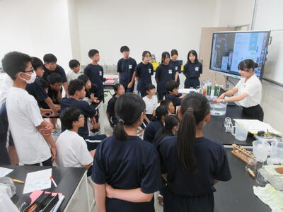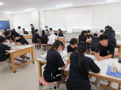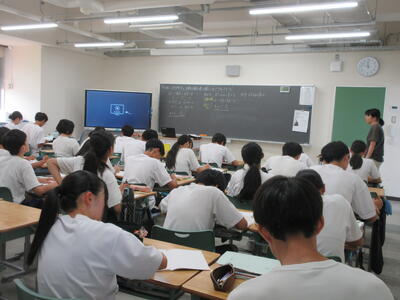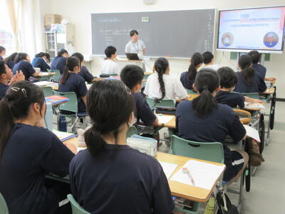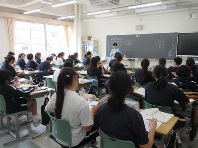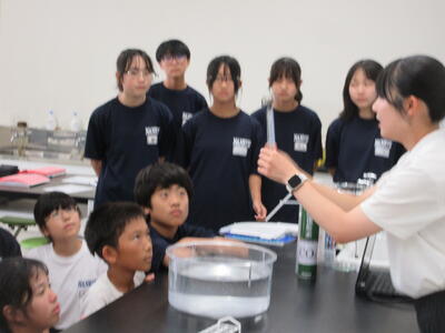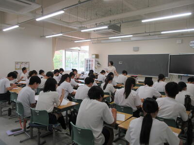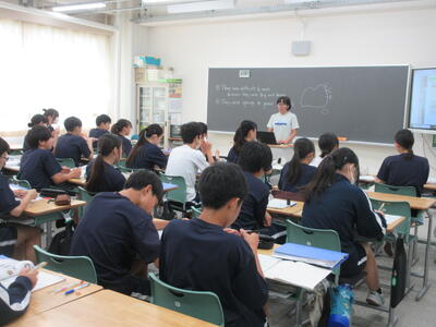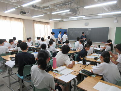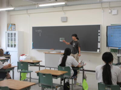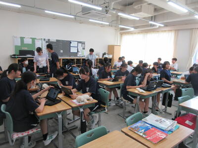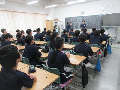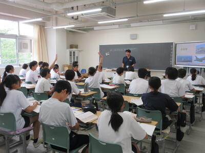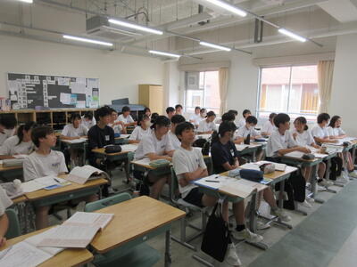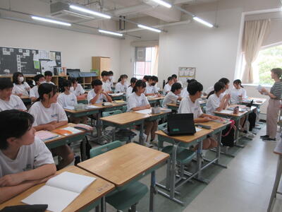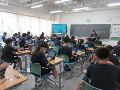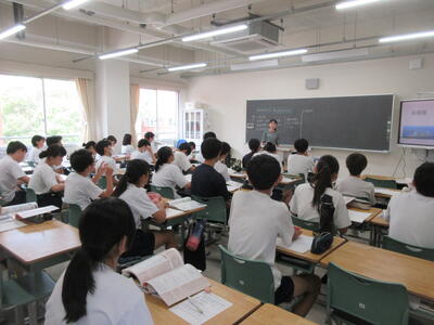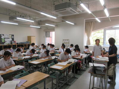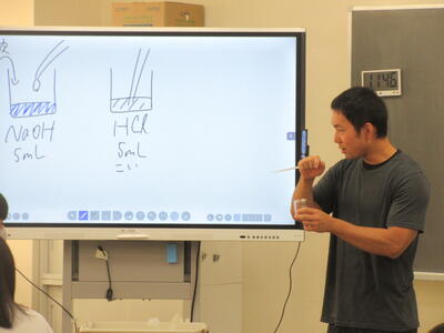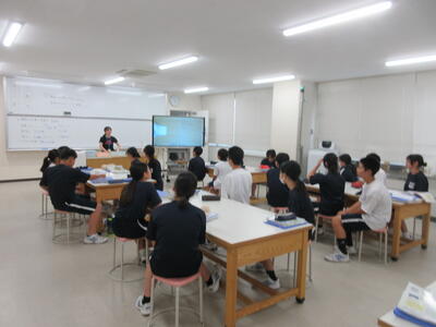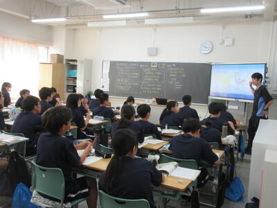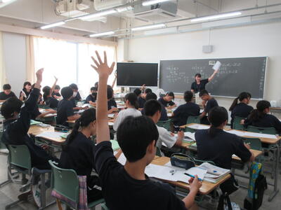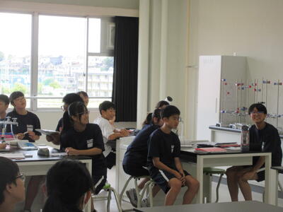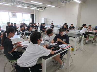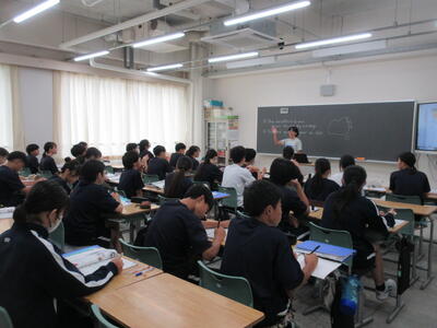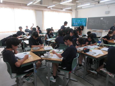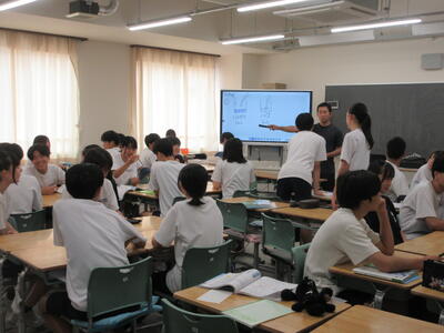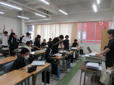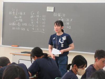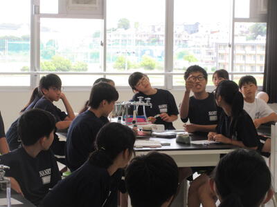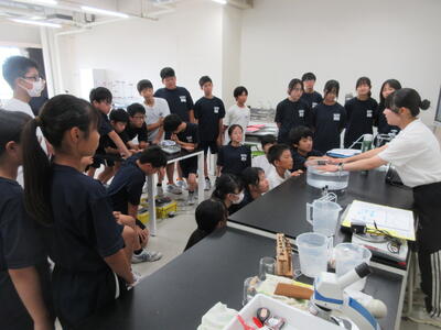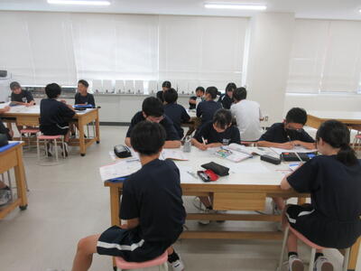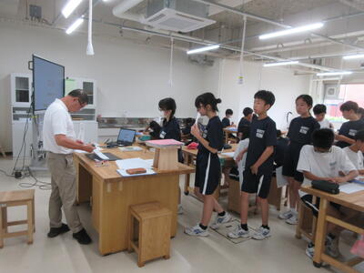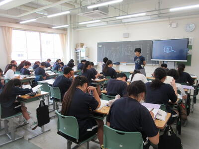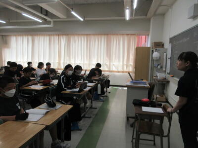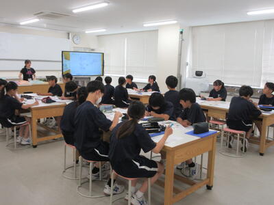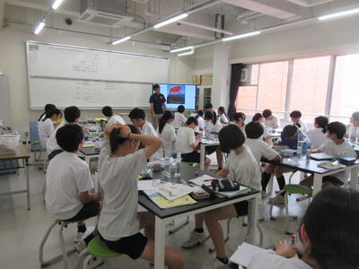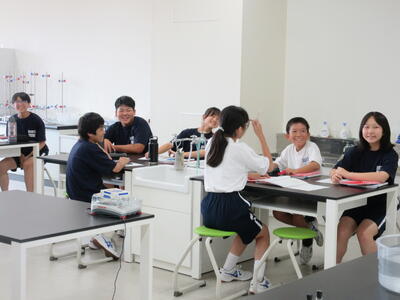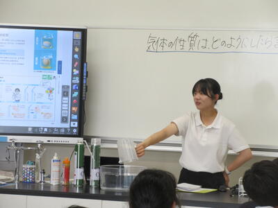 ▼今日も各教室で子ども達の頑張る姿が広がっています。下は第2理科室で行われている1年生理科の授業。授業の冒頭では、気体の名前を挙げる子ども達と本田先生の楽しいやりとりが行われています。