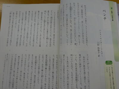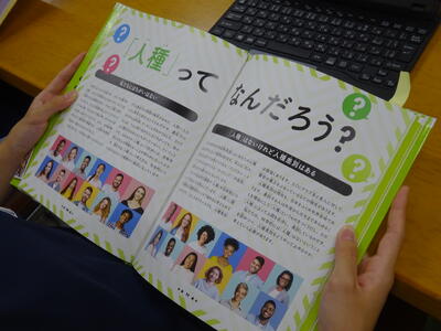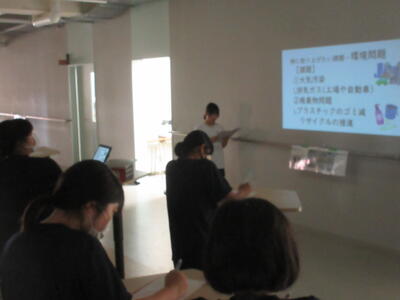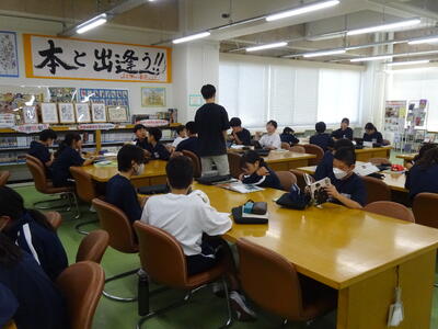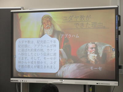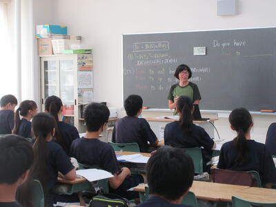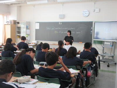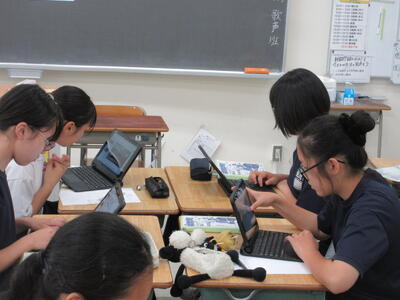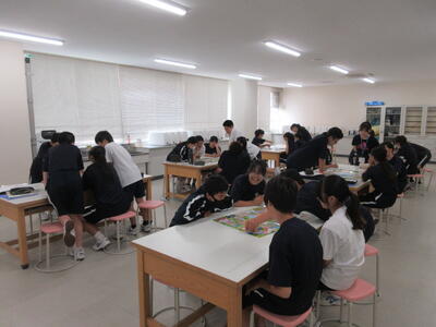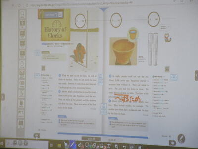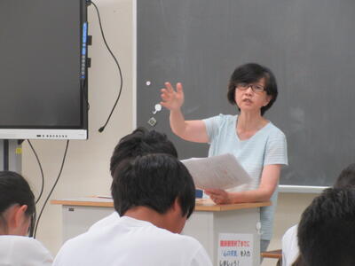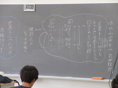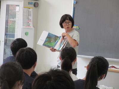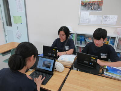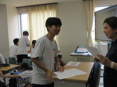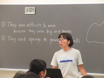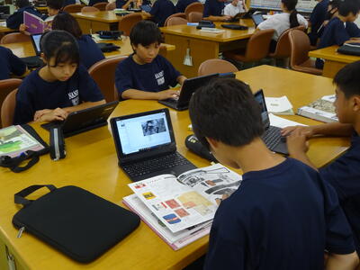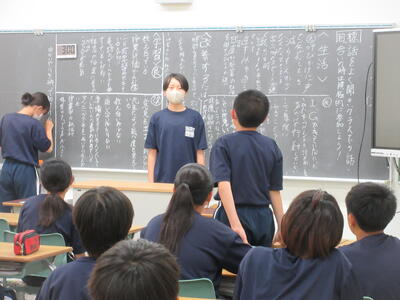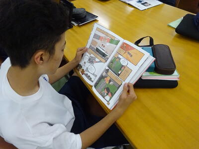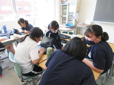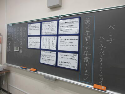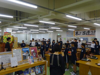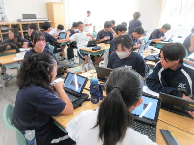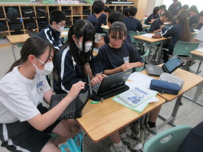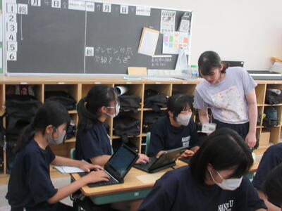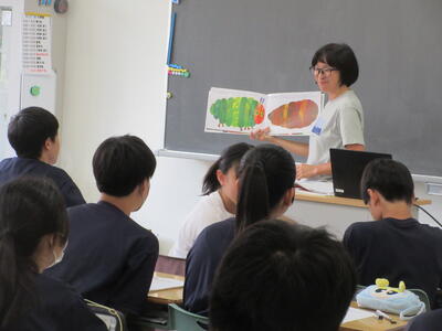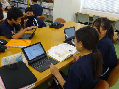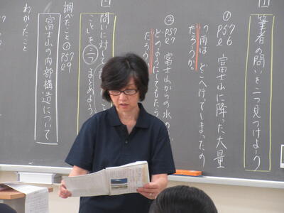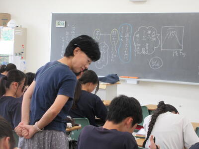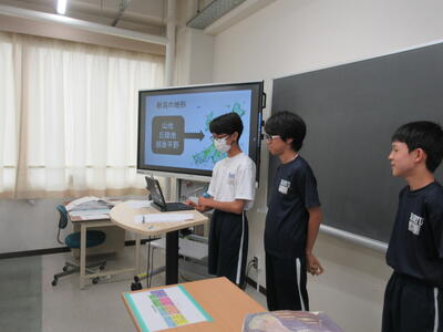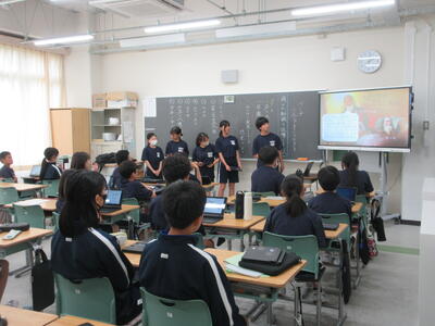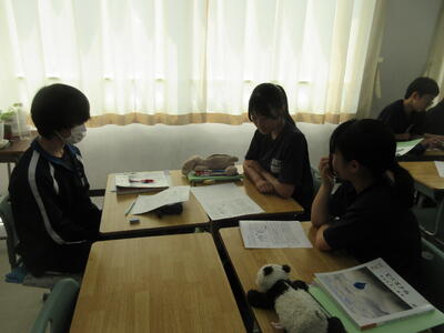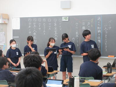 ▼1年生の国語の授業。ここでもグループごとに、教材について調べたことを発表しています。1年生も頑張っています!!