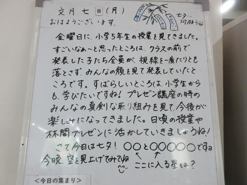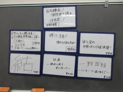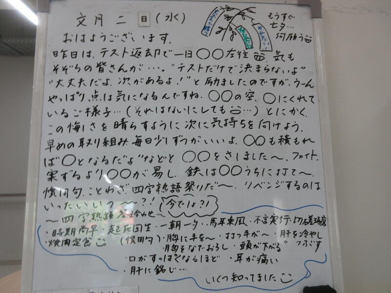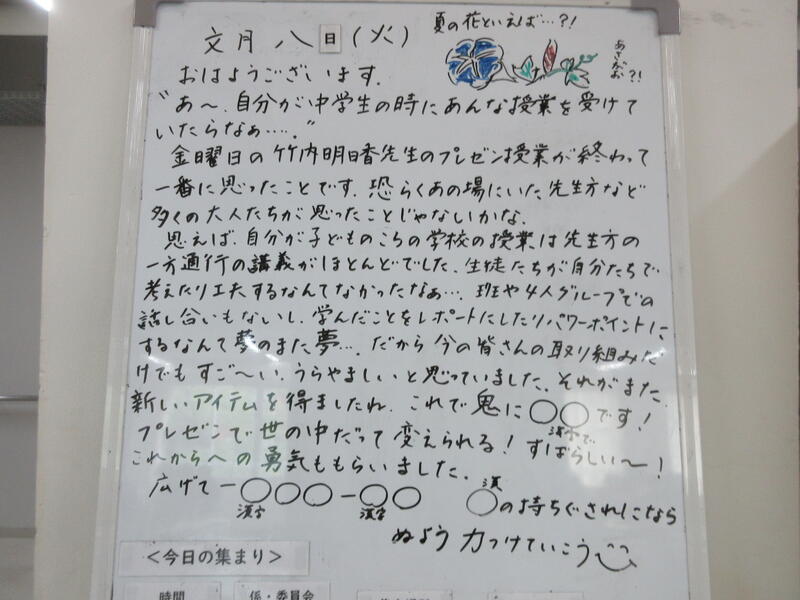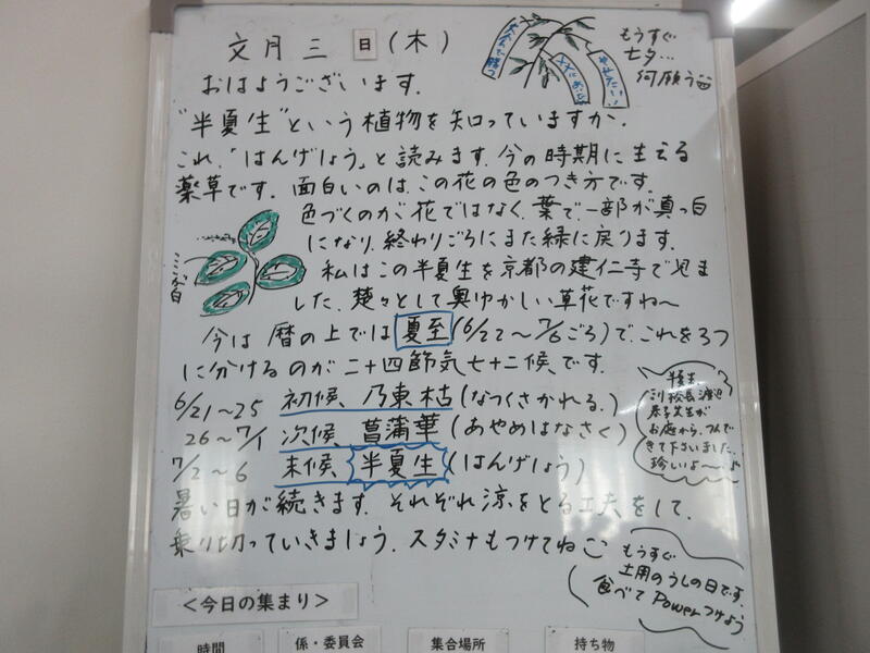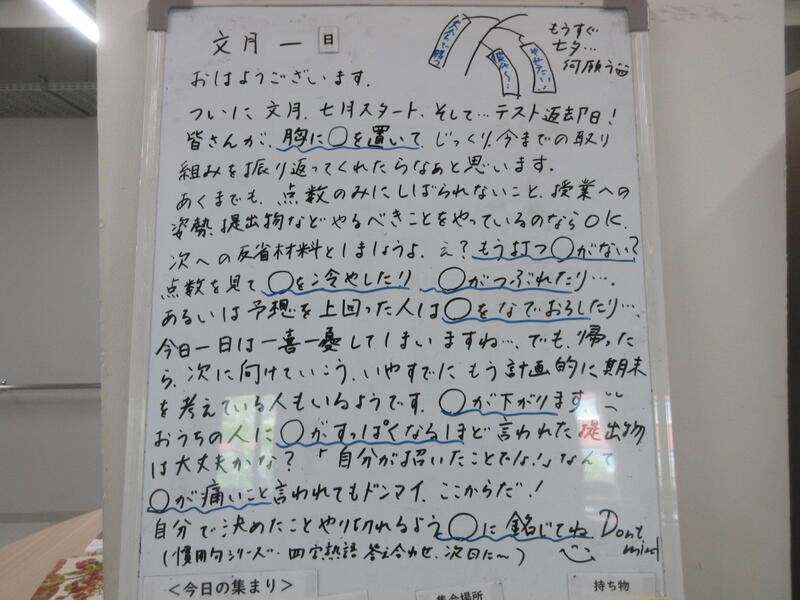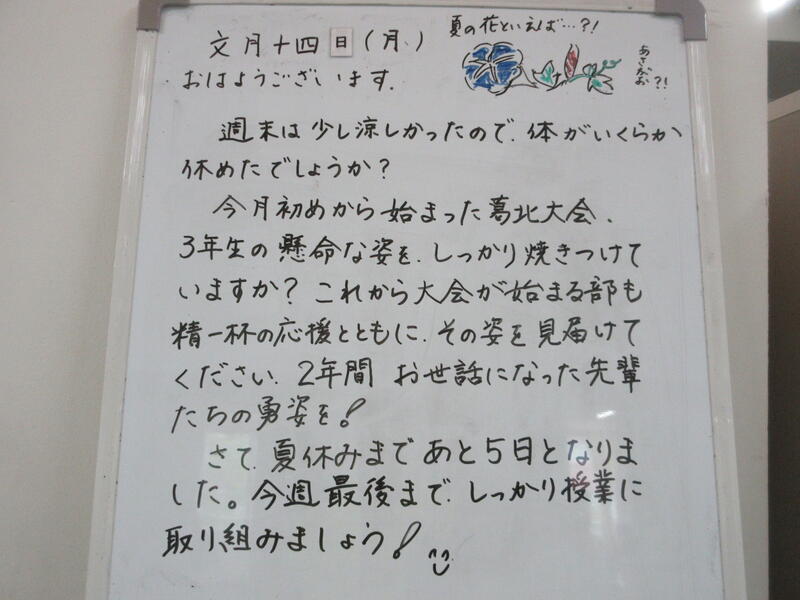 ▼C棟2階のホワイトボードには、学年主任の渡邉久子先生からのメッセージが書かれています。運動系の部活動では、3年生との活動も終わりに差し掛かります。3年生から何を学んで、何を行動化していくのか。下級生はじっくり考えて欲しいですね。