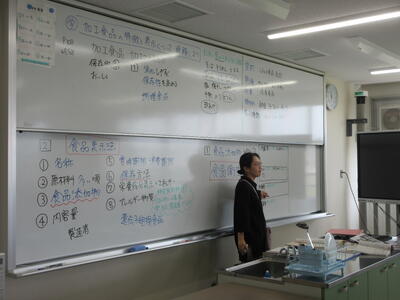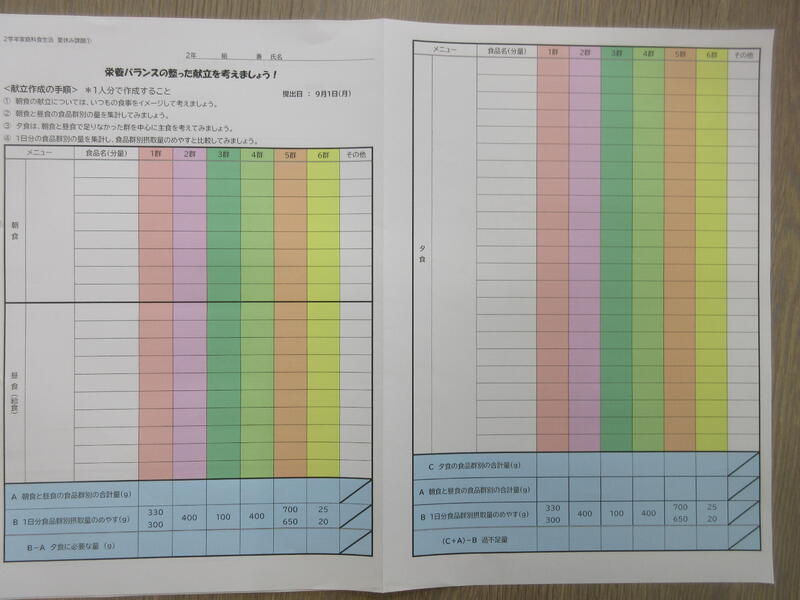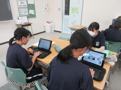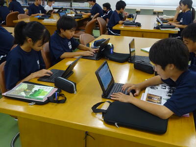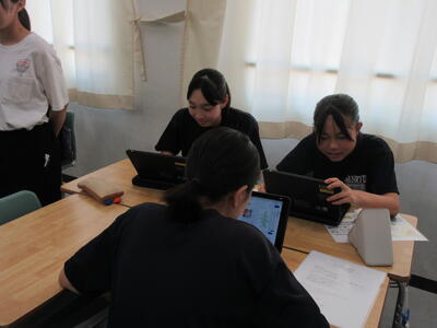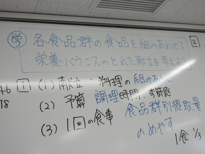 ▼被服室と廊下を挟んで反対側の調理室では2年生の家庭科の授業。「各食品群の食品を組み合わせて栄養のバランスのとれた献立を考えよう」がテーマ。子ども達はタブレット端末を活用して栄養成分表とにらめっこ。自分の好きだけでなく、栄養を考えていくことの大切さを実感していきます。