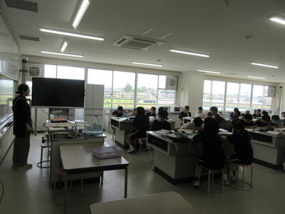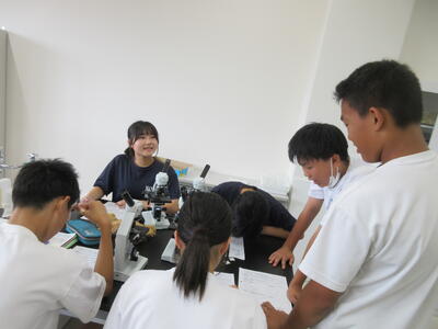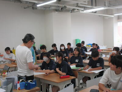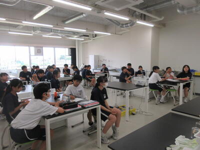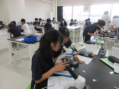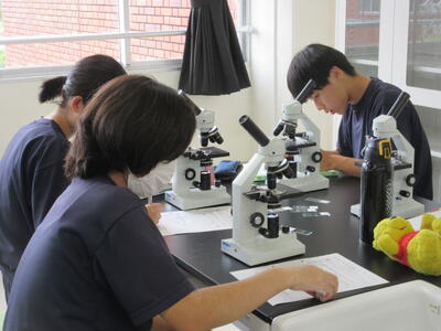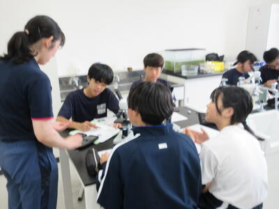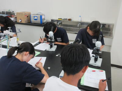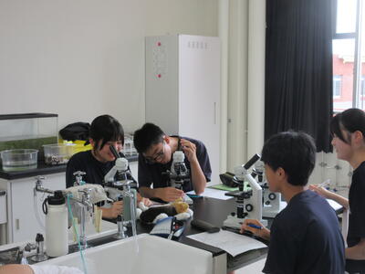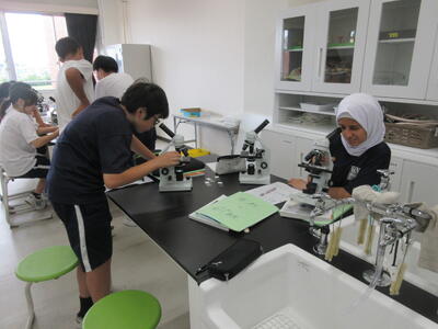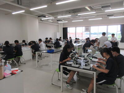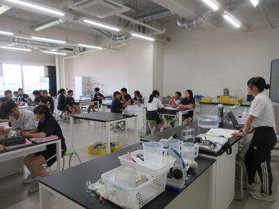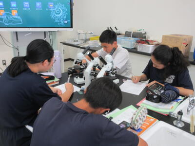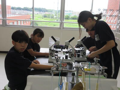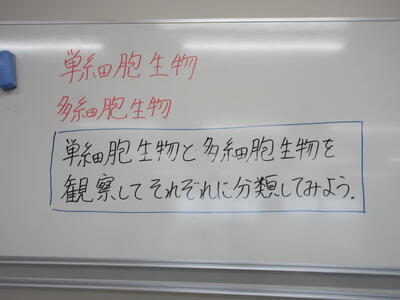 ▼第2理科室では2年生の理科「単細胞生物と多細胞生物を観察してそれぞれに分類してみよう」がテーマの授業。子ども達、顕微鏡を活用して学習を進めていきます。